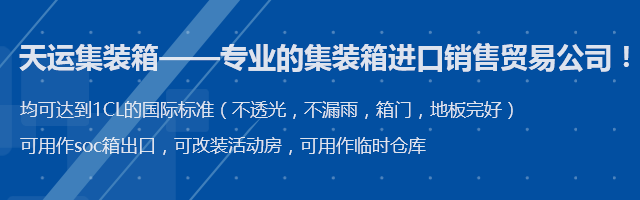 青島天運集裝箱服務有限公司,是專業(yè)的集裝箱進口銷售貿(mào)易公司,公司與各大船公司租箱公司保持著密切的合作關(guān)系,箱源充足,所有出售集裝箱均可達到IICL的國際標準(不透光,不漏雨,箱門,地板完好)可用作soc箱出口,可改裝活動房,可用作臨時倉庫。